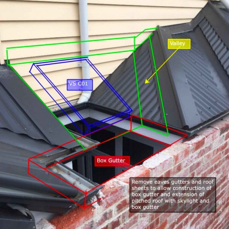 The solution was to remove some weatherboards, create a larger valley, install a wide box gutter that would tap back in to the existing gutter/drainage system and then install a skylight to ensure light wasn’t lost.