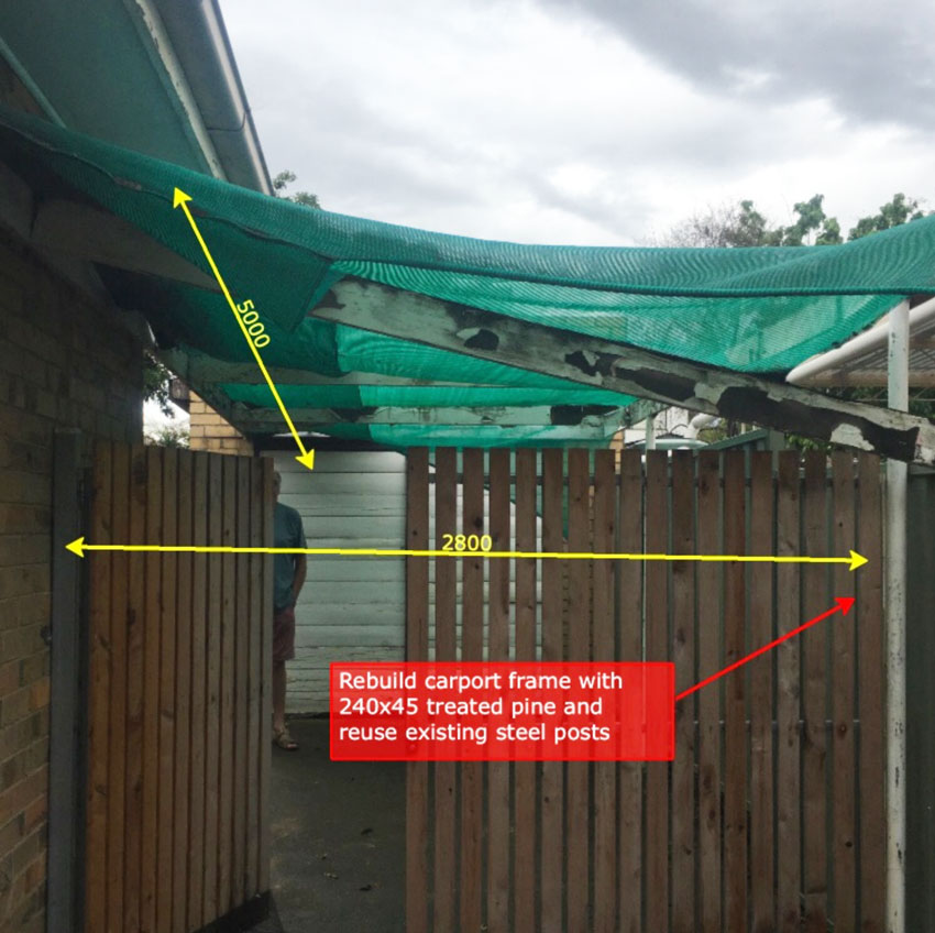 The carport (and we’re using the term loosely here) really consisted of only a couple of timbers connecting to a couple of steel poles and a bit of shadecloth thrown over the top.