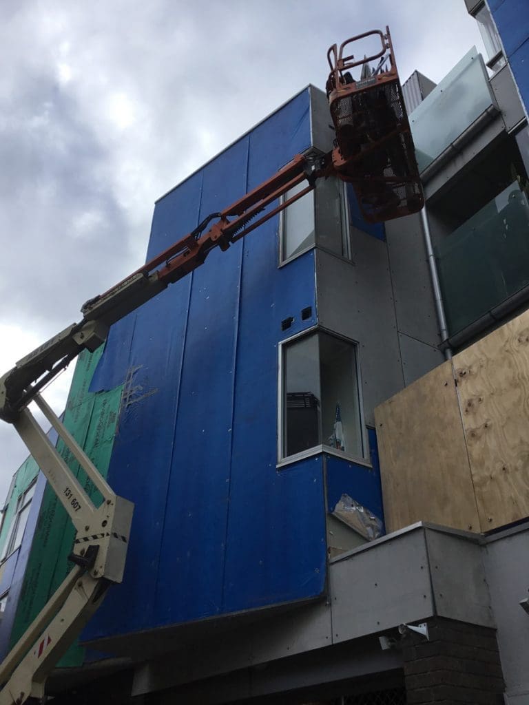 With careful planning, we managed to store most of the materials on the flat roof, ensuring they were easily accessible throughout the job. To prevent damage, we removed glass panels from the balconies before work began. Depending on the section of the building, we used a combination of scissor lifts, scaffolding, and ladders to safely install the new wall cladding.